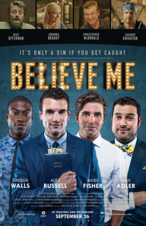 "Believe Me" involves the schemes of four desperate, broke college seniors who decide to start a fake Christian charity with the intention of using the money to pay their tuitions. "It's only a sin if you get caught," reads the tagline on the official website for "Believe Me."